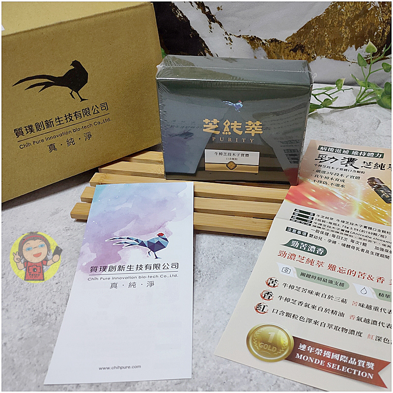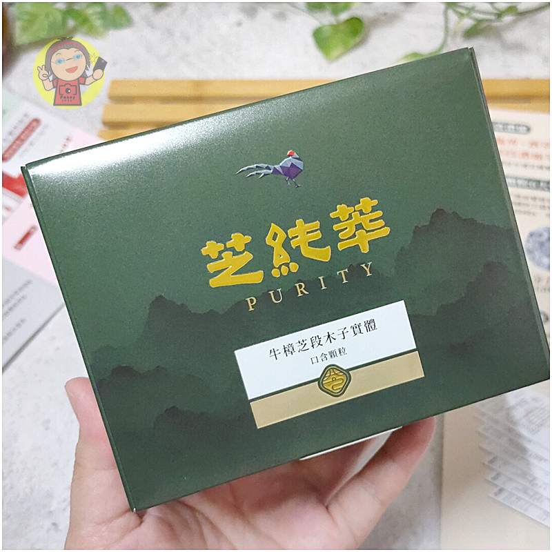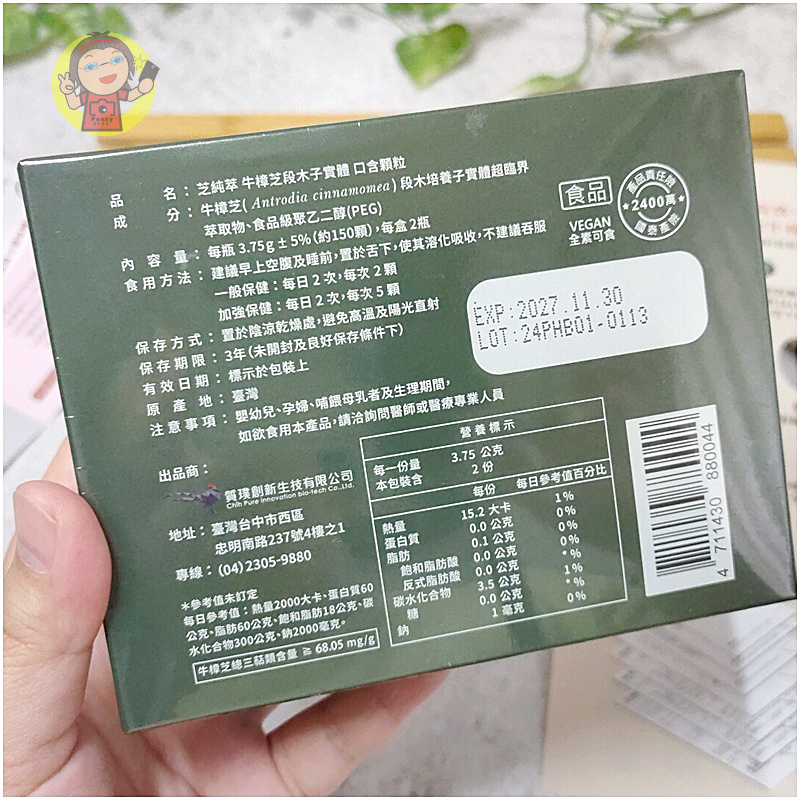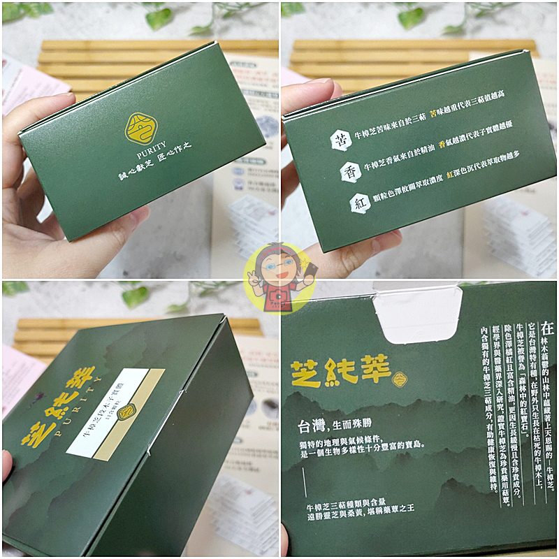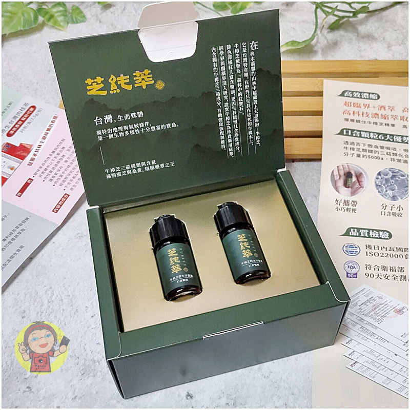 正面墨綠色標籤上寫著大大的「芝純萃」三字,下方標明「牛樟芝段木子實體口含顆粒」