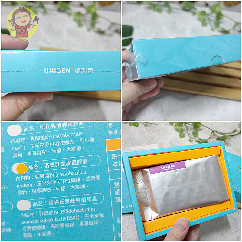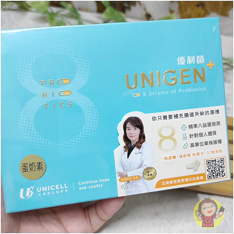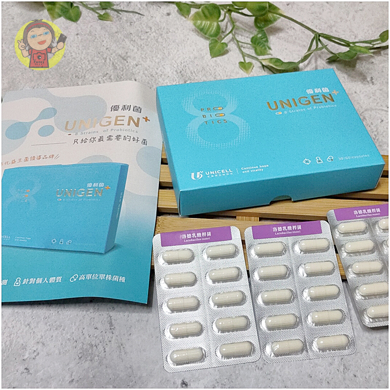 外盒是藍色打底,正面寫著 UNIGEN 優利菌 的品牌名稱,右下角還印著「生源診所院長唯一推薦」的字樣